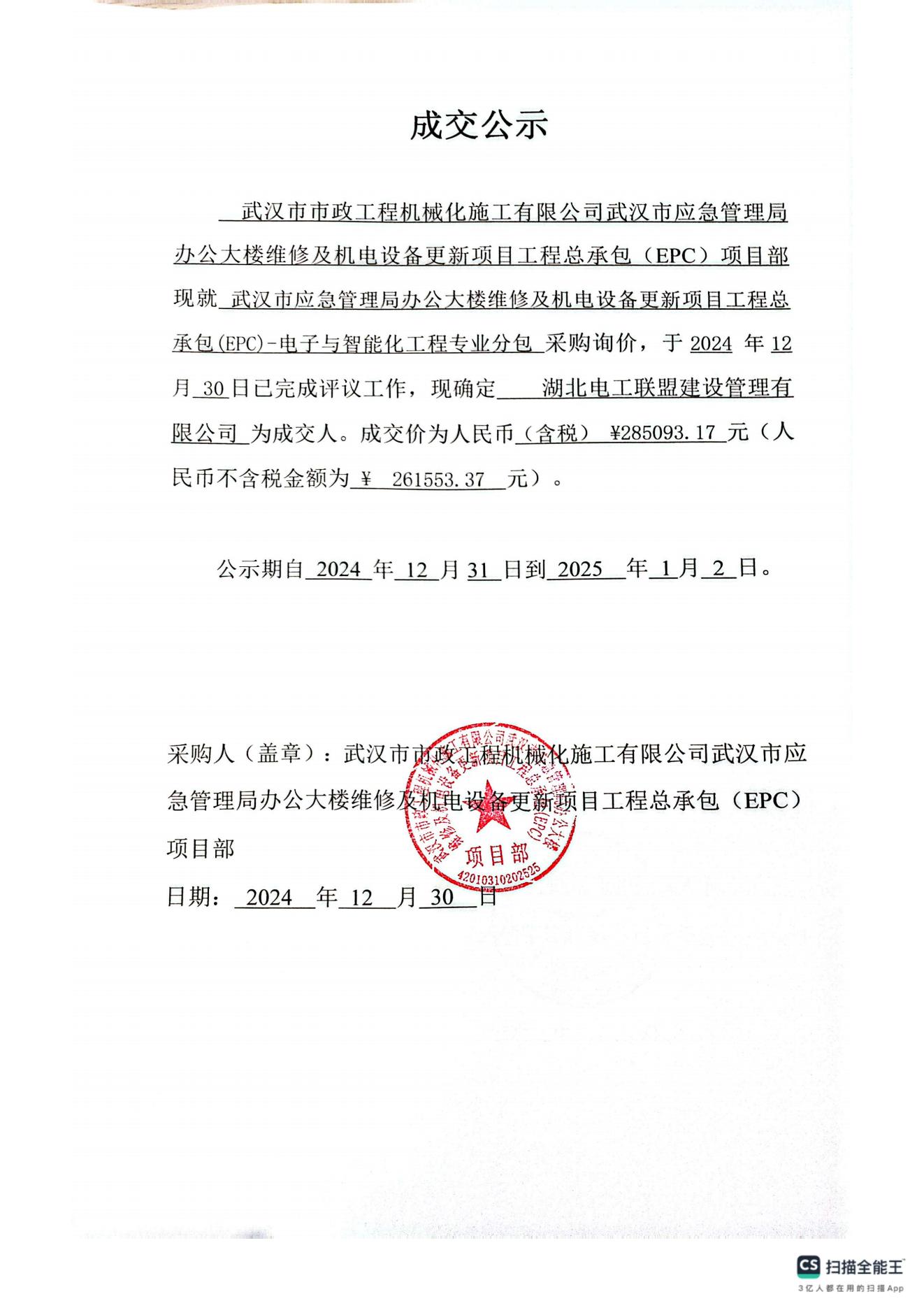 武漢市應(yīng)急管理局辦公大樓維修及機(jī)電設(shè)備更新項(xiàng)目工程總承包(EPC)-電子與智能化工程專(zhuān)業(yè)分包成交公示