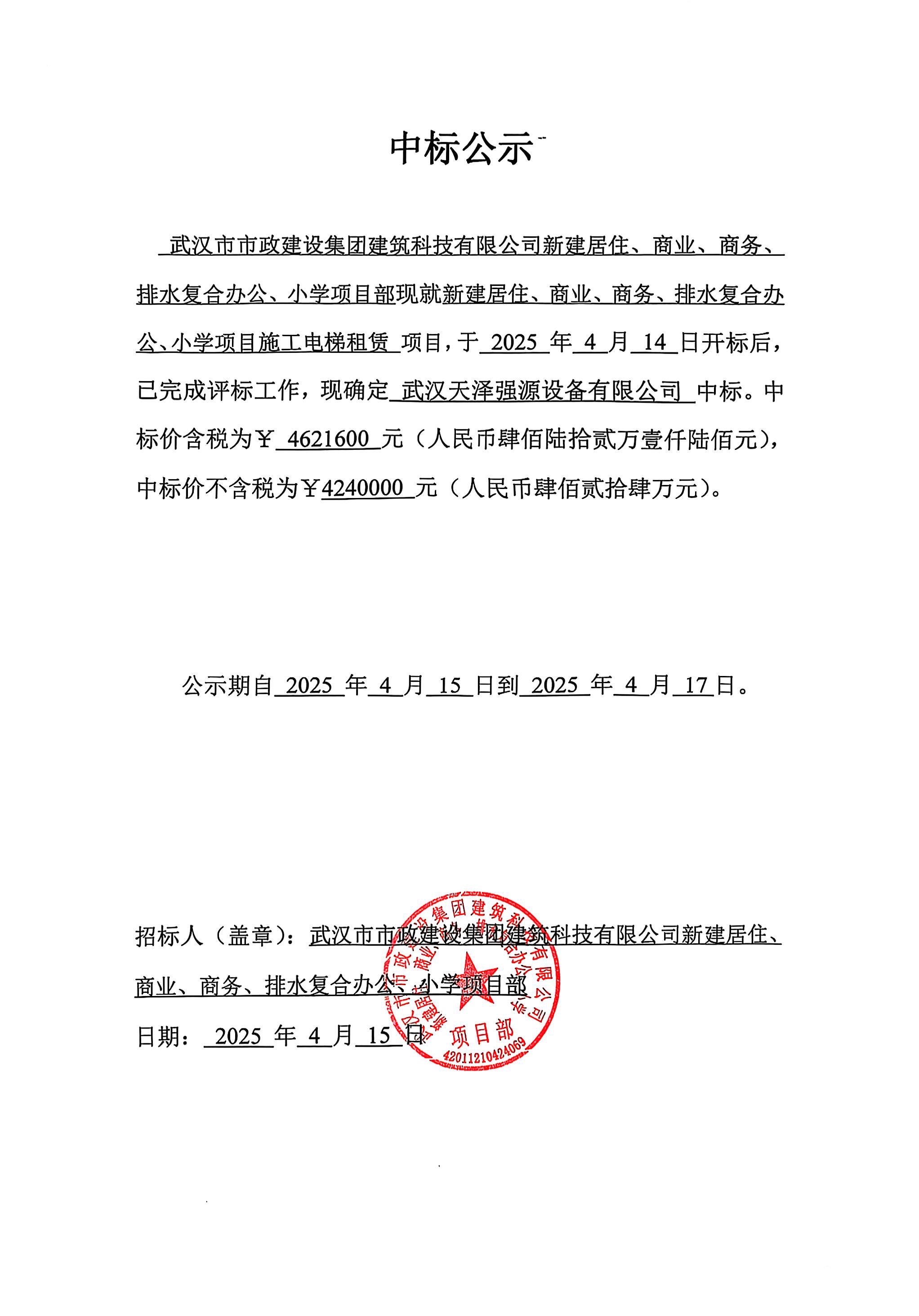 武漢市市政建設(shè)集團(tuán)建筑科技有限公司新建居住、商業(yè)、商務(wù)、排水復(fù)合辦公、小學(xué)項(xiàng)目施工電梯租賃中標(biāo)公示