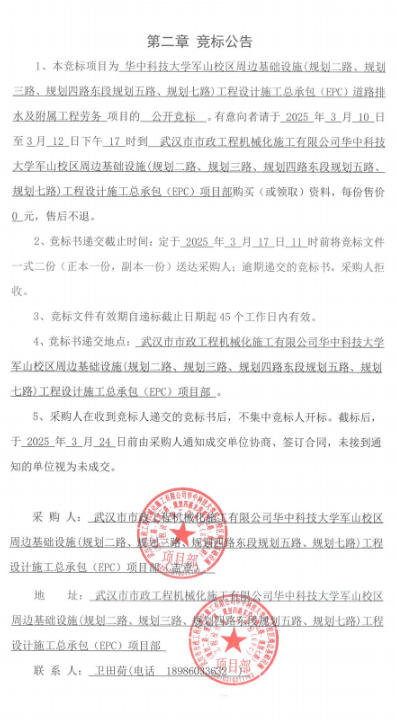 華中科技大學(xué)軍山校區(qū)周邊基礎(chǔ)設(shè)施(規(guī)劃二路、規(guī)劃三路、規(guī)劃四路東段規(guī)劃五路、規(guī)劃七路)工程設(shè)計施工總承包(EPC)道路排水及附屬工程勞務(wù)競標(biāo)公告