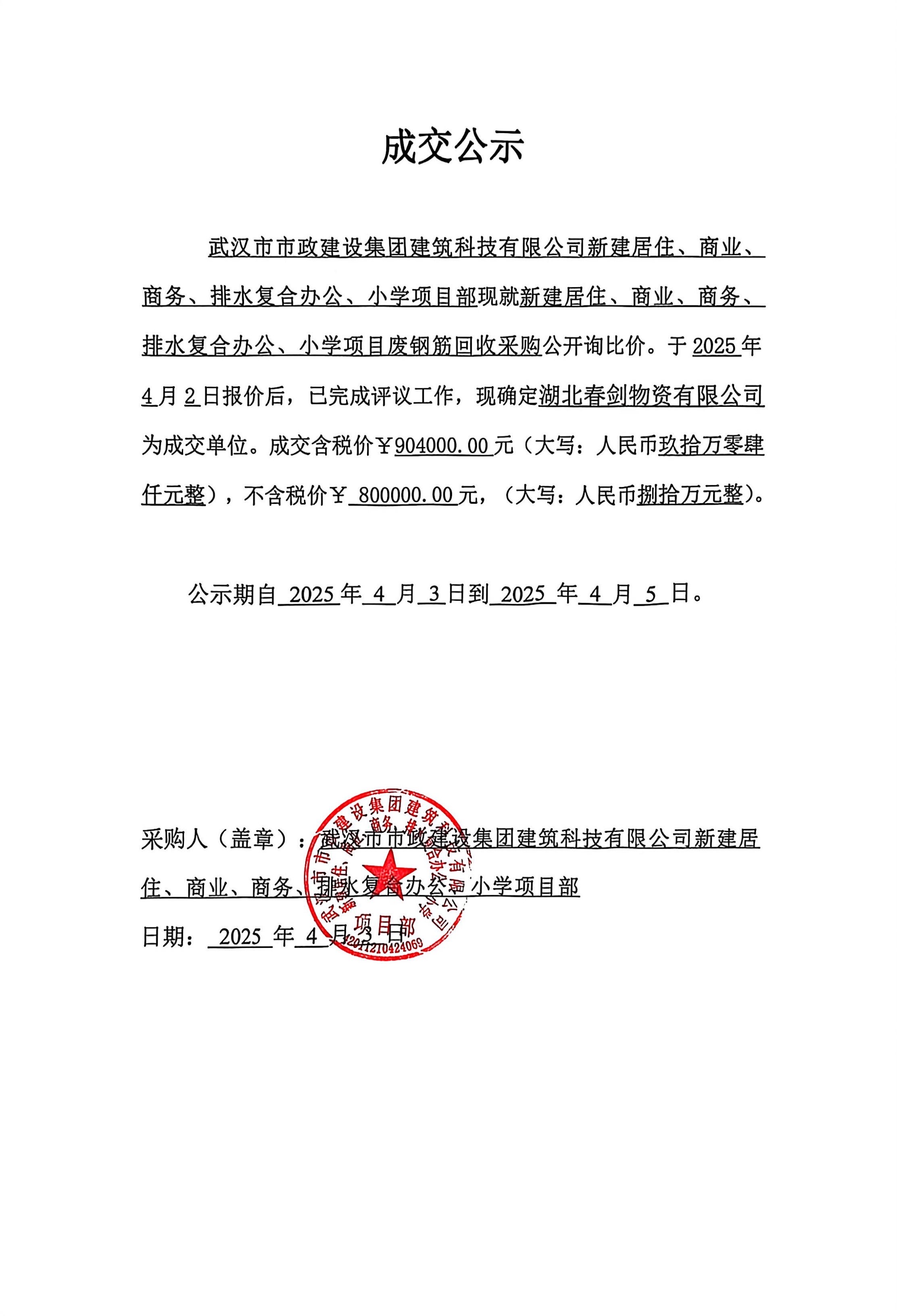 武漢市市政建設(shè)集團(tuán)建筑科技有限公司新建居住、商業(yè)、商務(wù)、排水復(fù)合辦公、小學(xué)項(xiàng)目廢鋼筋回收采購成交公示