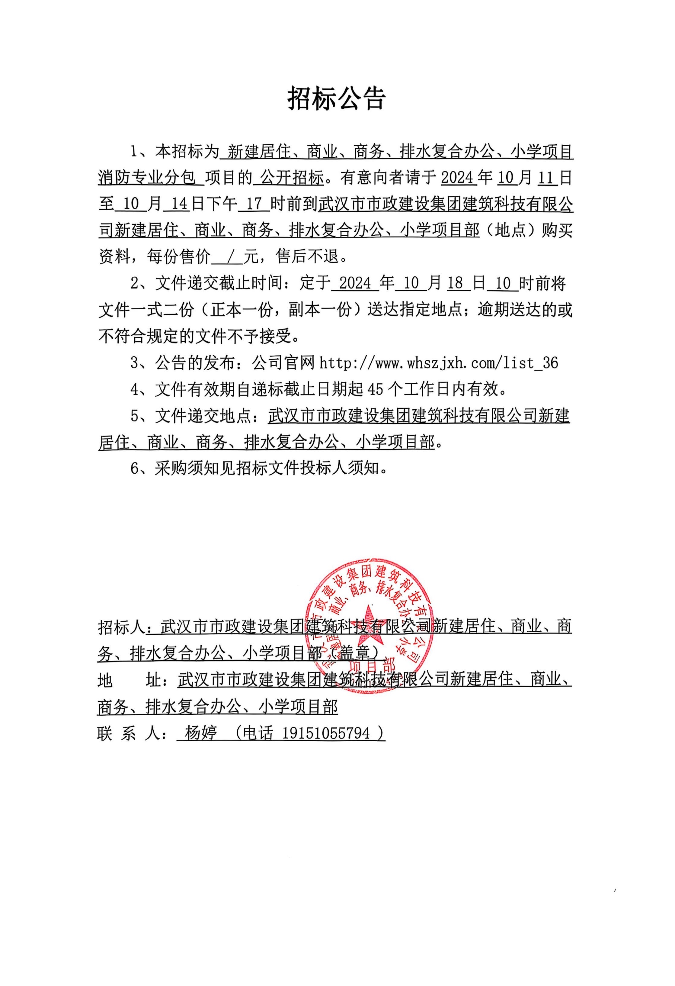 武漢市市政建設(shè)集團(tuán)建筑科技有限公司新建居住、商業(yè)、商務(wù)、排水復(fù)合辦公、小學(xué)項(xiàng)目消防專業(yè)分包招標(biāo)公告